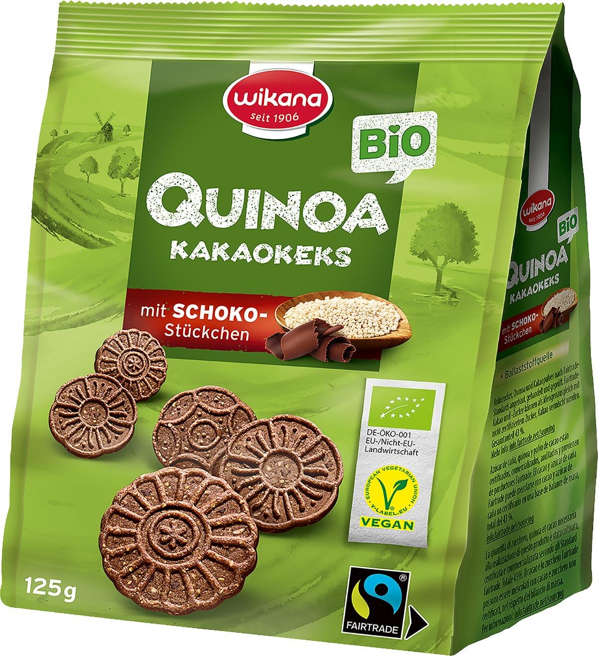 Das südamerikanische Quinoa-Getreide ist ein besonderer Rohstoff dieses köstlichen Gebäckstücks mit eingebackenen Schokoladenstückchen und intensivem Kakaogeschmack. Für die Herstellung dieses Kakaokekses werden fair gehandelte (Fairtrade-Gesamtanteil 43 Prozent) und kontrolliert biologisch angebauten Zutaten verwendet. Der Verbraucher hat die Möglichkeit auf ein einzigartiges Geschmackserlebnis bei welchem er sich vegan ernährt und den fairen Handel unterstützt.