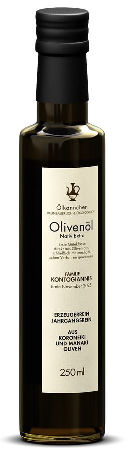 Familie Kontogiannis – Bio Olivenöl nativ extra - Dieses mild- bis mittelfruchtige Bio-Olivenöl erster Güteklasse stammt von der Familie Kontogiannis aus dem Herzen des Peloponnes. Die Olivenhaine und Weinberge liegen an den Ausläufern des antiken Korinth, einer Region mit jahrtausendealter Landwirtschaft und einzigartigem Terroir. Durch die biodynamische Bewirtschaftung mehrerer Parzellen in unterschiedlichen Höhenlagen vereint die Familie Kontogiannis das gesamte aromatische Spektrum des korinthischen Terroirs in einem Öl. Verarbeitet werden ausschließlich Oliven der traditionellen Sorten Manaki und Koroneiki, die dem Öl seine ausgewogene Struktur, feine Fruchtigkeit und elegante Milde verleihen. Das kleine Landgut wird seit 2006 konsequent biologisch-dynamisch bewirtschaftet. Die Olivenbäume wachsen ohne künstliche Bewässerung, werden sorgfältig beobachtet und mit natürlichen Kräutersuden gestärkt. Ein besonderes Augenmerk gilt der Förderung der Biodiversität: Theodorus Kontogiannis sammelt gezielt Samen endemischer Wildkräuter und -blumen, vermehrt sie und bringt sie auf seinen Parzellen aus – zum Schutz des Bodens, gegen Erosion und für ein lebendiges Ökosystem. QUALITÄTSANALYSE (Auszug) vom 30.12.2025: Freie Fettsäuren: 0,43 % · Peroxidzahl: 9,4 meq O₂/kg · K232: 1,55 · K268: 0,14 · ΔK: -0,00. Erzeuger-, sorten- und jahrgangsreine Abfüllung. Ernte: Oktober–November 2025
