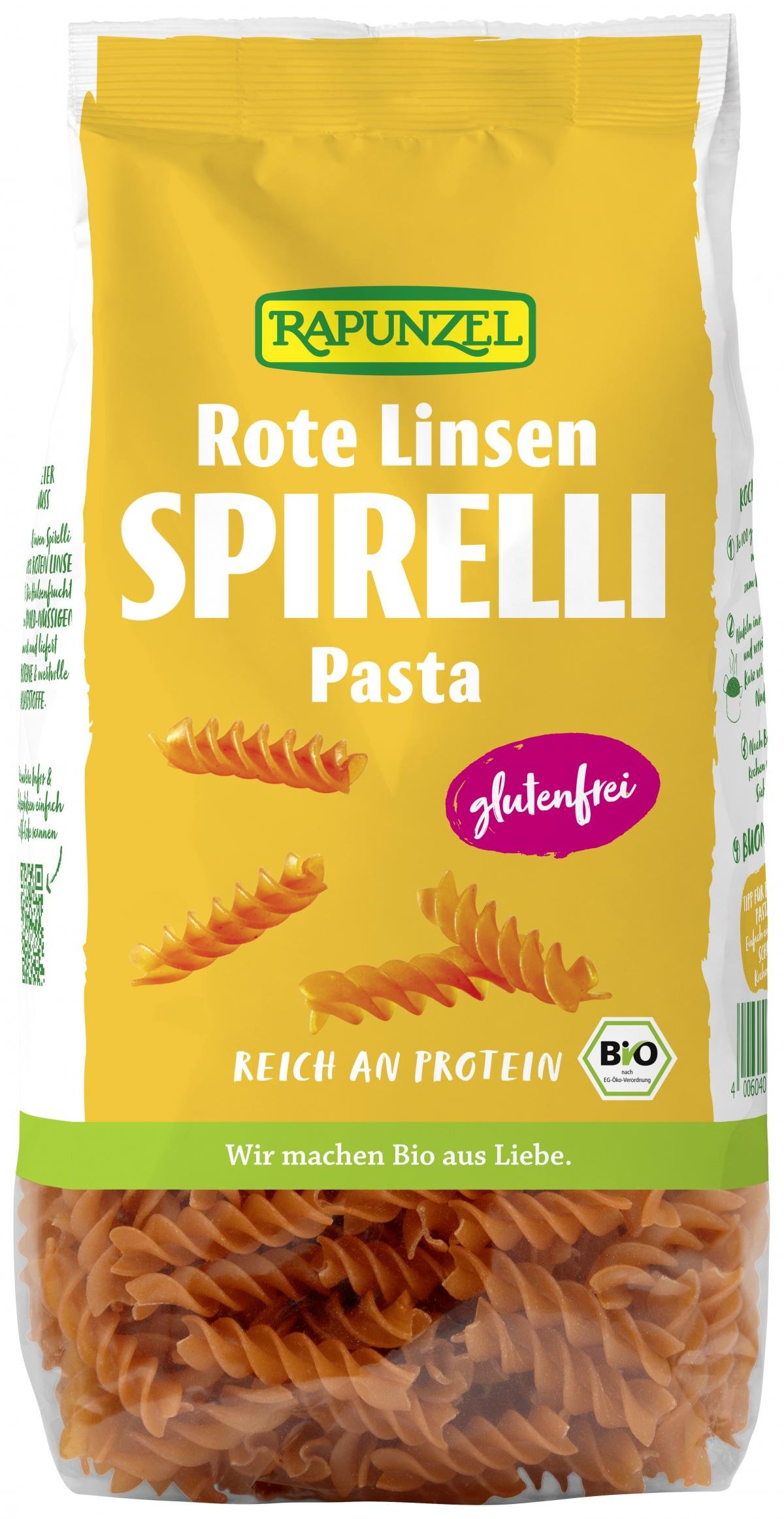 Der mild-nussige Geschmack der roten Linse, die schnelle Zubereitung und der gute Biss machen die Spirelli zur perfekten Alternative zu Getreide-Pasta. Sie sind reich an Folsäure, Eisen und Zink. Rote Linsen Spirelli enthalten nur wenige Kohlenhydrate und sind perfekt für eine kohlenhydratreduzierte Ernährung und Menschen die auf Gluten verzichten möchten geeignet.