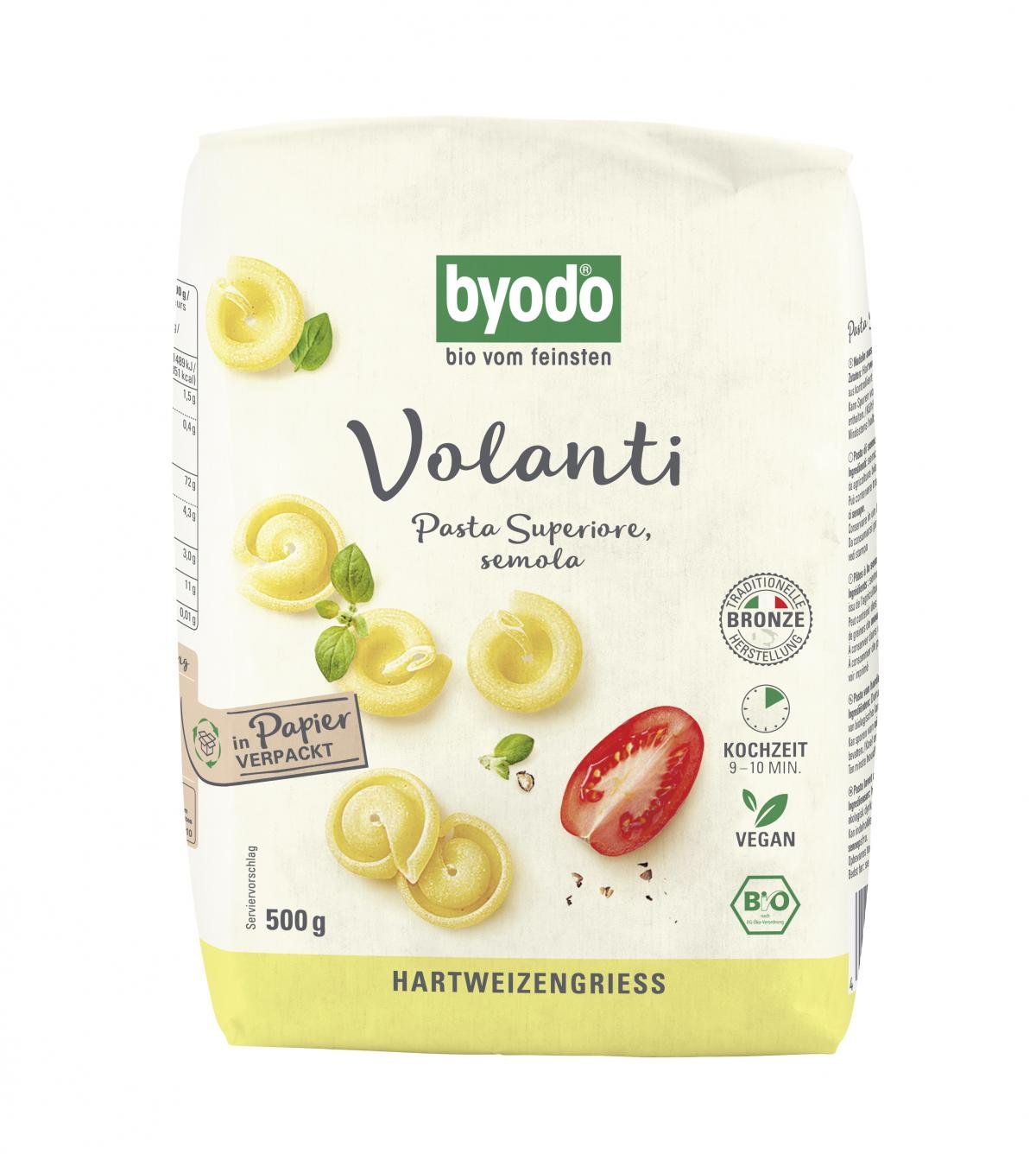Die Volanti, semola von Byodo werden aus feinstem italienischen Bio-Hartweizengrieß hergestellt. Die originelle Form überzeugt mit einem schönen Biss.