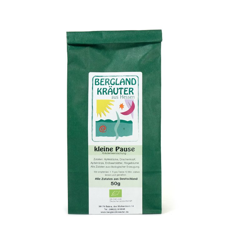 Es handelt sich bei dieser milden Mischung um einen Tee für jede Gelegenheit, sozusagen für die kleine Pause. Der große Anteil an hessischen Äpfeln garantiert die fruchtige, Note die Kräuterkomponenten unterstreichen dies in ausgewogener und milder Weise.