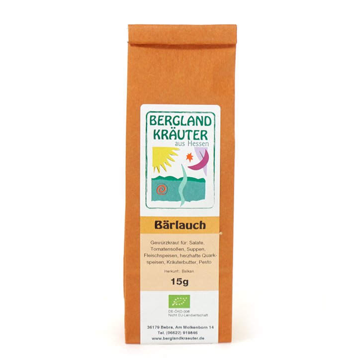 Zutaten: getrocknete, gerebelte Bärlauch-Blätter (EU-Bio) Würzig-frisches Aroma duftet und schmeckt stark nach Knoblauch. Gewürzkraut für: Salate, Tomatensoßen, Suppen, Fleischspeisen, herzhafte Quarkspeisen, Kräuterbutter, Pesto