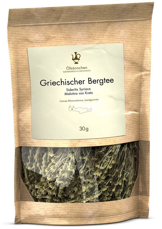 Griechischer Bio Bergtee Sideritis syriaca - Dem griechischen Bergtee oder auch griechischen Eisenkraut (Sideritis) werden vielfältige gesundheitsfördernde Eigenschaften zugesprochen und es gibt verschiedene Unterarten. Die Unterart Sideritis syriaca ist auf Kreta endemisch und wird Malotira genannt. Unser Malotira wächst auf den Felder der Familie Psyllakis, die in den Bergen von Omalos auf Westkreta auf einer Höhe von ungefähr 1000m liegen. Rodo und Nikos Psyllakis bewahren mit ihrem kleinen landwirtschaftlichen Betrieb nach ökologischen Richtlinien die biologische Vielfalt der Region und leben mit ihrer Leidenschaft für nachhaltigen, naturschützenden Kräuteranbau ihren Respekt vor der Natur. Der Malotira wird von Hand geerntet und die Trocknung geschieht natürlich in Bündeln ohne Zufuhr maschineller Wärme. So werden die einzigartigen Eigenschaften und die besonderen Aromen des Bergtees bewahrt. Malotira schmeckt floral-fruchtig, auch mit leichten Noten von Rose und süßem Salbei. Die Teeblüten in Dolden mit kochendem Wasser aufgießen und ein paar Minuten ziehen lassen. Auch ein zweiter und dritter Aufguss ist möglich. Dann die Stängel vorab entfernen.