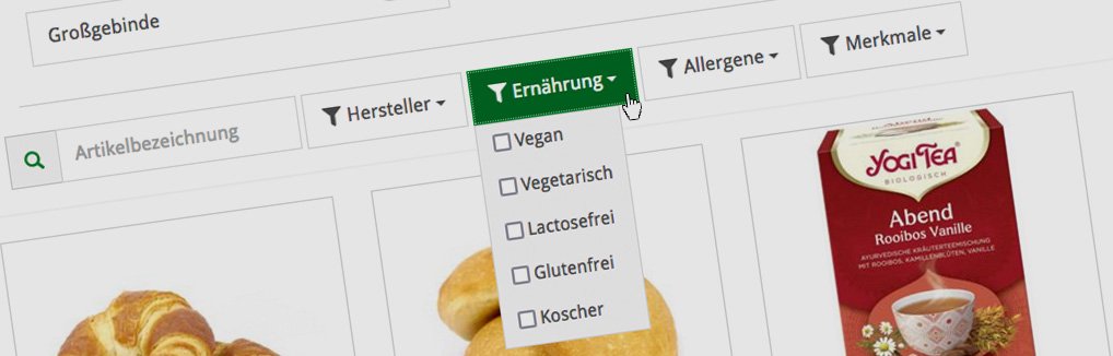 Wenn Sie eine Artikelkategorie (z.B. Naturkost) auswählen, finden Sie die Filter: