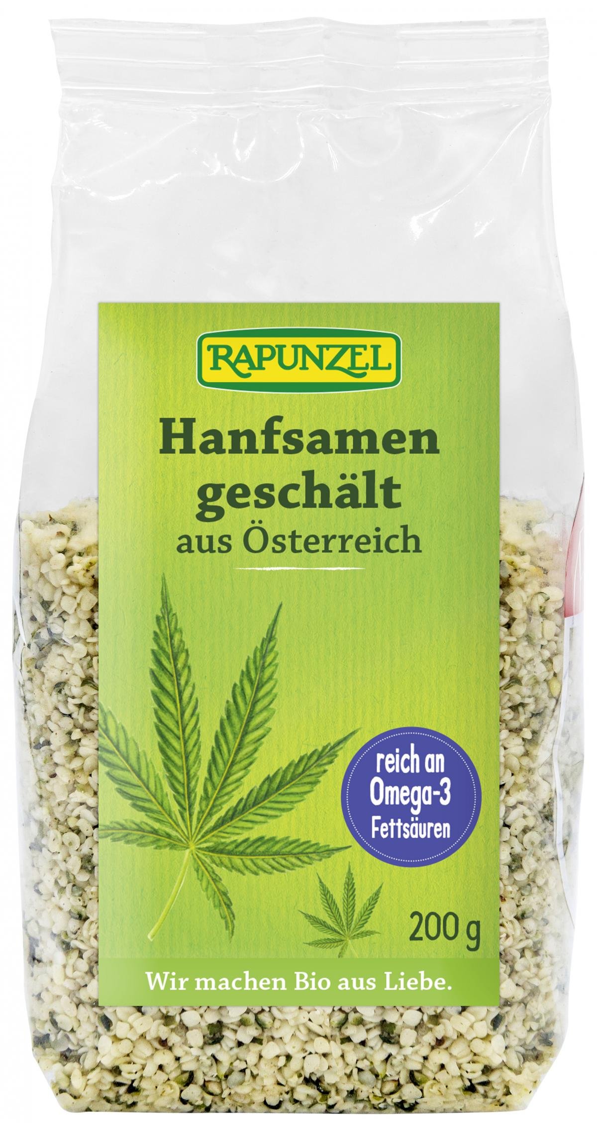 Hanfsamen sind zart und fein nussig im Geschmack und besonders reich an Omega-3-Fettsäuren, Thiamin, Magnesium, Zink und Eisen. Sie enthalten alle 8 essentiellen Aminosäuren (diese kann der Körper nicht selbst bilden) und sind damit als Eiweißquelle bestens geeignet. Der Nährstoffgehalt von Hanfsamen ist hoch, aber high wird man nicht von ihm: Die Hanfsamen stammen von Speisehanf, der keine berauschende Wirkung hat. Die wertvollen Samen werden von Hanfbauern in Österreich angebaut und haben Rohkostqualität. Sie werden im Hause Rapunzel unter Schutzatmosphäre abgepackt.