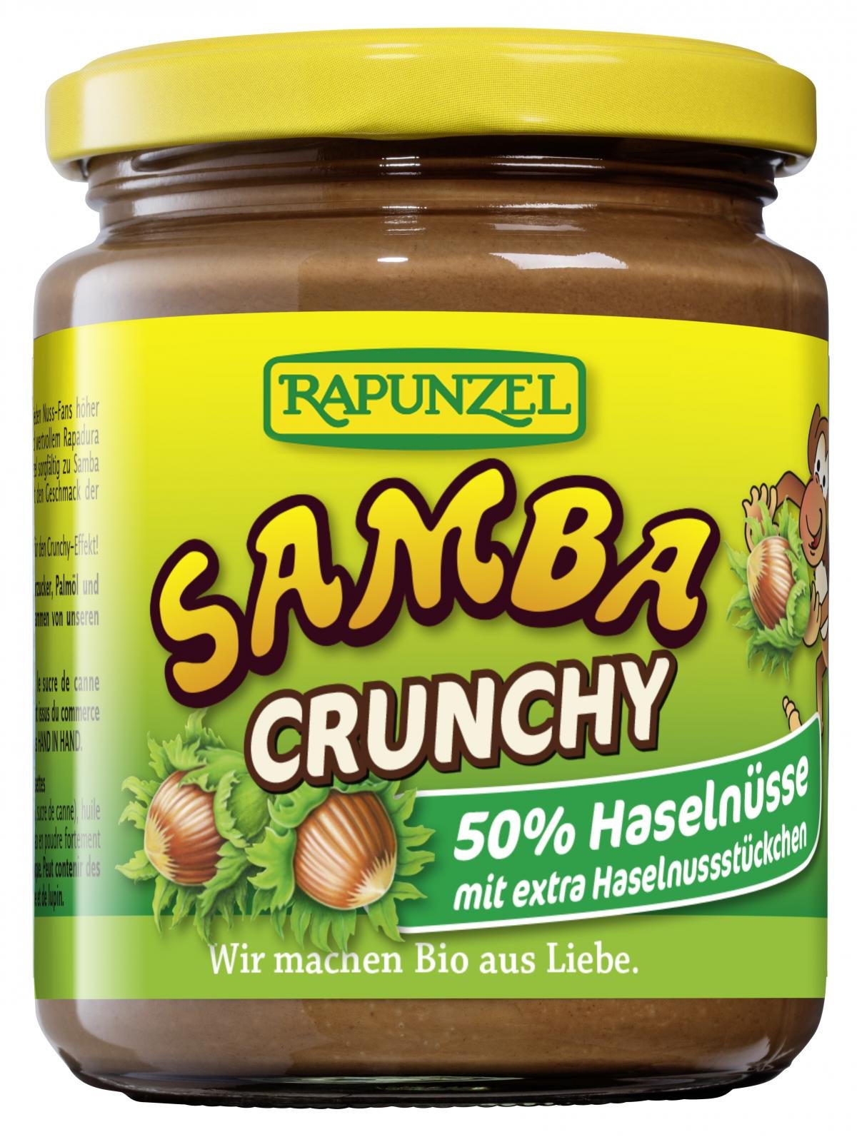 Starten Sie mit Samba Crunchy schwungvoll in den Tag! 50% aromatisch geröstete Haselnüsse lassen das Herz eines jeden Nuss-Fans höher schlagen. Zusammen mit edlem Kakao, Allgäuer Vollmilch und wertvollem Rapadura Vollrohrzucker werden sie zu Samba Crunchy verarbeitet. Ein Hauch echter Bourbon Vanille rundet den Geschmack der wertvollen Zutaten ab. Das besondere Extra: mit knackig gerösteten Haselnussstückchen für den Crunchy-Effekt! Rapadura Vollrohrzucker, Cristallino Rohrzucker, Palmöl und Kakaopulver sind fair gehandelt und stammen von unseren HAND IN HAND-Partnern. Die Konsistenz ist temperaturabhängig. Bei Zimmertemperatur cremig, im Kühlschrank gelagert fest.