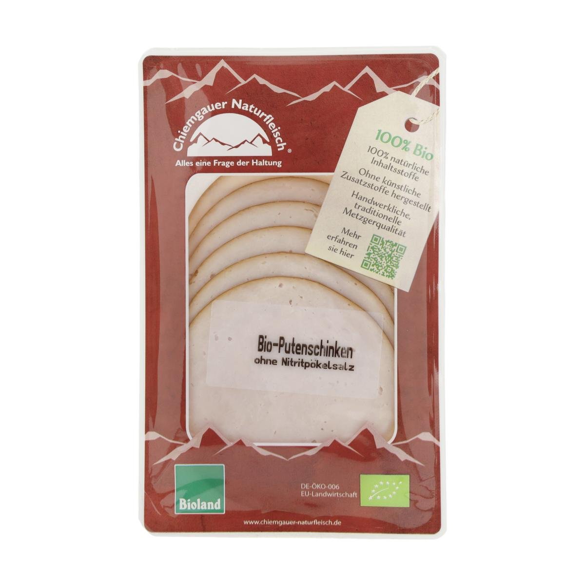 Traditionell hergestellter Kochschinken, aus der Putenbrust mit hervorragendem Geflügelaroma, leicht geräuchert, in Scheiben geschnitten.