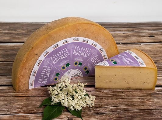 Herausgekommen ist ein fein milder Käse von schöner cremiger Textur, der eine ungeahnte Harmonie eingeht mit dem edlen, typischen Aroma der Holunderblüte.